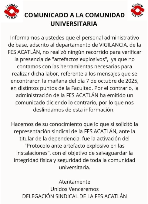 Sin embargo, la Delegación Sindical de la FES Acatlán emitió una versión contrastante. Según su comunicado, el personal administrativo de vigilancia no efectuó el recorrido de verificación de artefactos debido a que, presuntamente, no cuentan con las herramientas ni el equipo necesario para llevar a cabo una labor de tal magnitud y riesgo.
