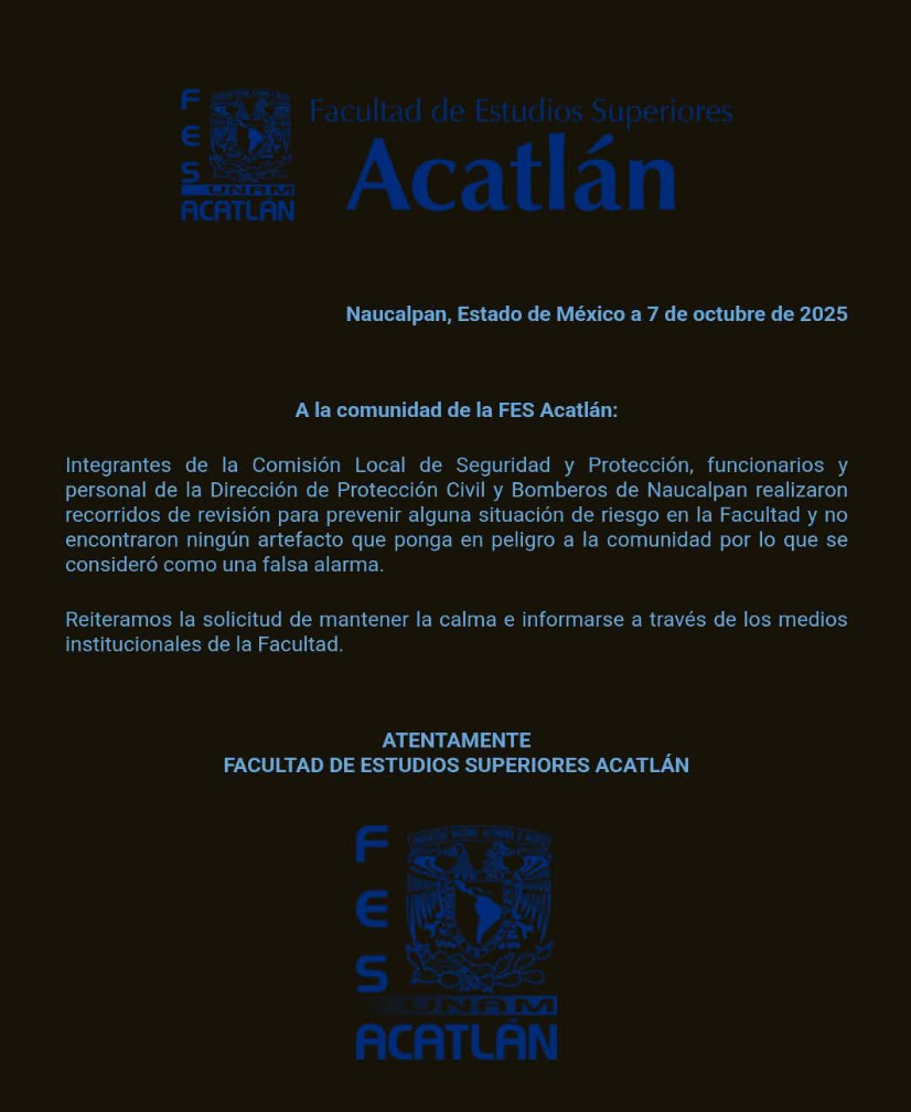 Tras la alerta, la FES Acatlán emitió un comunicado informando que se realizaron recorridos de revisión en las instalaciones, concluyendo que no se encontró ningún artefacto que representara peligro para la comunidad universitaria. Personal de vigilancia, directivos y la Dirección de Protección Civil y Bomberos de Naucalpan continuaron realizando rondas preventivas.